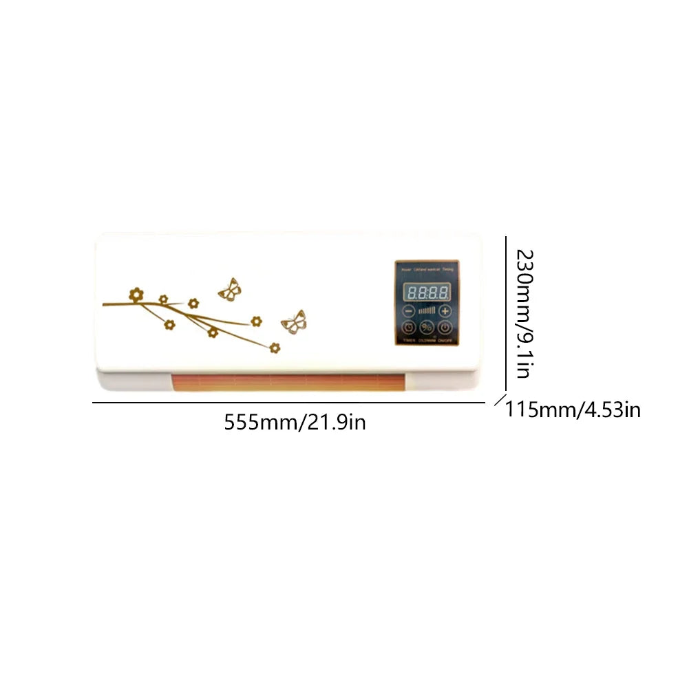 Feature: 1. Heating Air Conditioner: Our wall-mounted heating air conditioner provides a versatile solution for year-round comfort, ensuring you stay warm in winter. 2. High Efficiency with Reduced Energy Consumption: With an impressive 98% electric heat conversion rate, our unit delivers high-temperature heating while reducing energy consumption by 50%. The 1400W power saves you approximately 1 kWh of electricity per day. 3. Touch Control and Remote: Enjoy intuitive control with the intelligent touch screen interface, and easily adjust settings using the compact and convenient remote control. 4. Instant Heating: Experience quick and efficient heating with our unit's rapid heat-up time. The silicon crystal heating plate features dense and efficient heat distribution, providing fast temperature increase and improved airflow for enhanced comfort in various situations. 5. Intelligent Thermostat: Achieve uniform heat distribution and maintain a comfortable temperature throughout the entire space. The intelligent thermostat ensures full coverage warmth for your entire family, while optimizing energy efficiency and saving on heating costs. Specification: Color: As shown in the picture Size: 555 * 115 * 230mm/21.85 * 4.52 * 9.05inch Rated power: 1400W Control: remote control Suitable area: 30 square meters