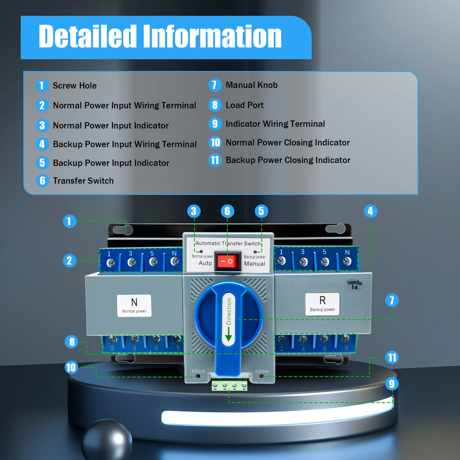 Manual Knob: In manual mode, you can switch between normal/backup power by turning the large knob to make the operation simple and clear.